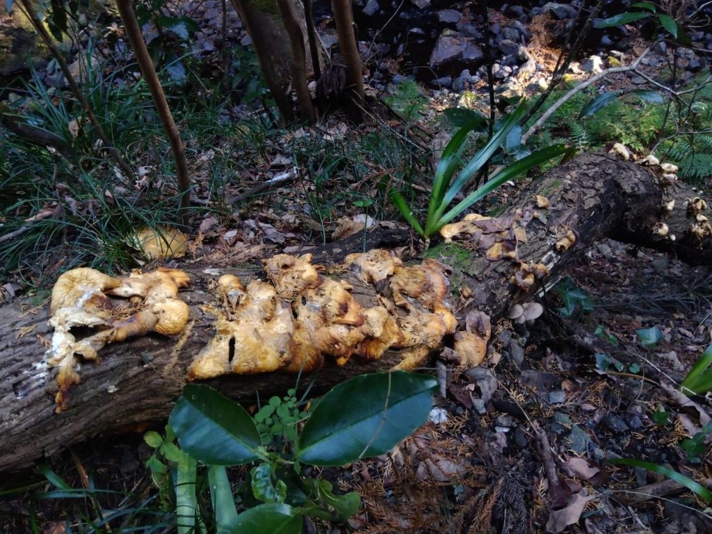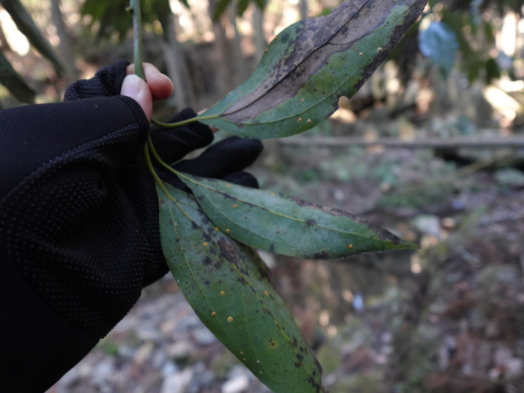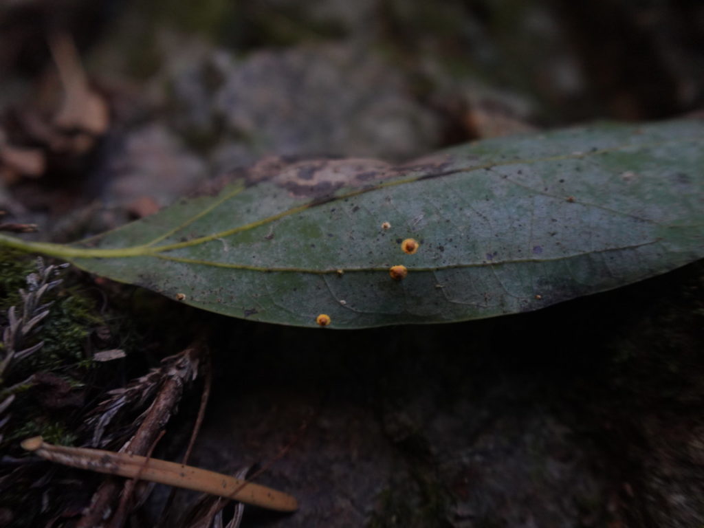 沢沿いのシロダモの裏に多数見られました。1枚の葉に、最低でも2つの子実体が確認でき、多い所では約10個体以上確認できました。宿主からしたらまさに凄惨な現場と言った所でしょう。